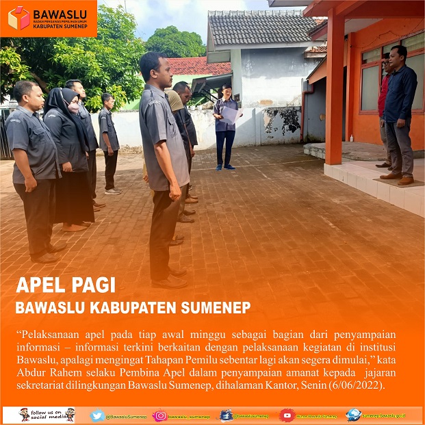 "Pelaksanaan apel pada tiap awal minggu sebagai bagian dari penyampaian informasi-informasi terkini berkaitan dengan pelaksanaan kegiatan di institusi Bawaslu, apalagi mengingat tahapan sebentar Pemilu sebentar lagi akan segera dimulai," kata Abddur Rahem selaku pembinan apel dalam menyampaikan amant kepada jajaran sekretariat dilingkungan Bawaslu Sumenep, dihalaman Kantor.