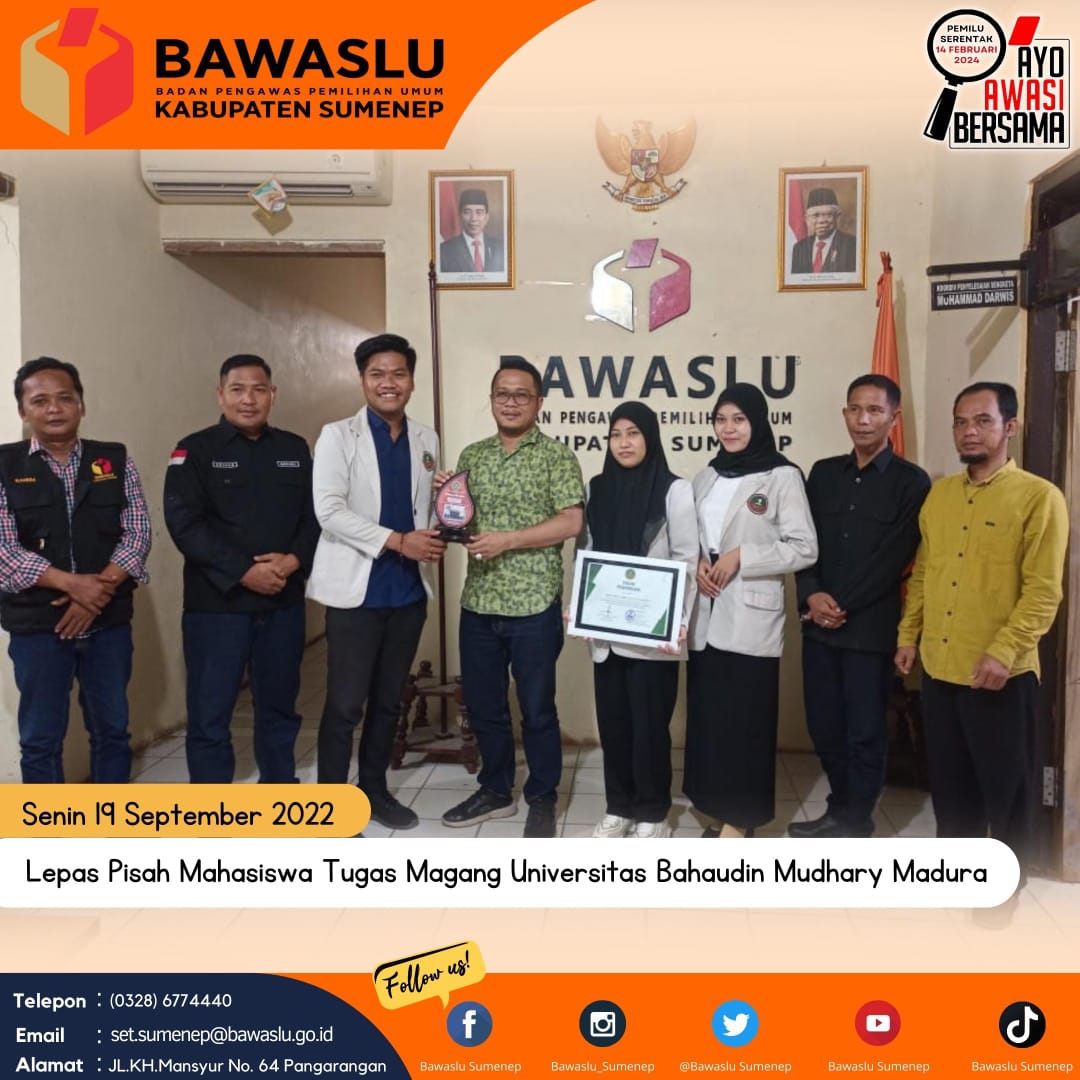 sumenep.bawaslu.go.id - SUMENEP. Bawaslu Kabupaten Sumenep Lepas 4 (Empat) Mahasiswa Magang dari Universitas Bahauddin Mudhary Madura, Senin (19/9/2022).