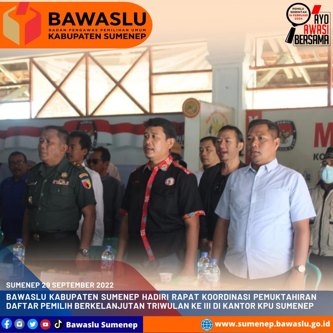 sumenep.bawaslu.go.id - SUMENEP. Bawaslu Kabupaten Sumenep dalam hal ini Hosnan Hermawan selaku Koordiv. Pencegahan, Partisipasi Masyarakat, dan Humas menghadiri Rapat Koordinasi Pemutakhiran Data Pemilih Berkelanjutan Triwulan ketiga Tahun 2022 di Kantor Komisi Pemilihan Umum Kabupaten Sumenep, Kamis (29/9/2022).