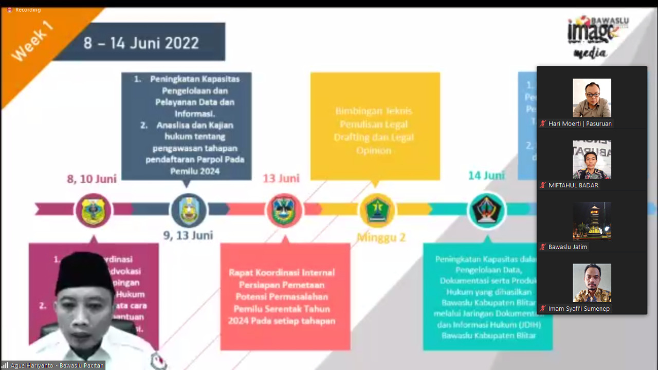 Rabu (8/06/2022) Bawaslu Sumenep, dalam hal ini Imam Syafii selaku Koordinator Divisi HHDI mengikuti kegiatan tersebut secara daring, ini sesi ketiga dengan tema rencana kegiatan periode bulan Juni-Juli 2022.