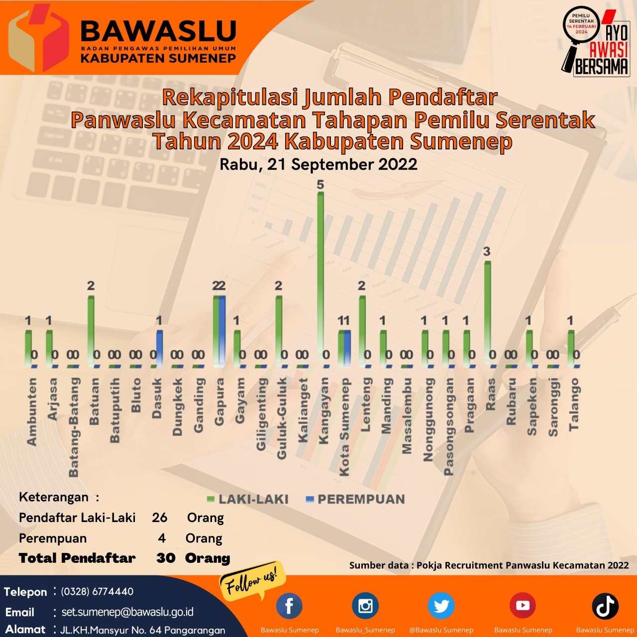 sumenep.bawaslu.go.id - Kota Sumenep. Hari pertama Pendaftaran dan Penerimaan Berkas Calon Anggota Panwaslu Kecamatan Pemilu Serentak Tahun 2024 di lingkungan Bawaslu Kabupaten Sumenep mencapai 30 orang pendaftar, Rabu (21/9/2022).