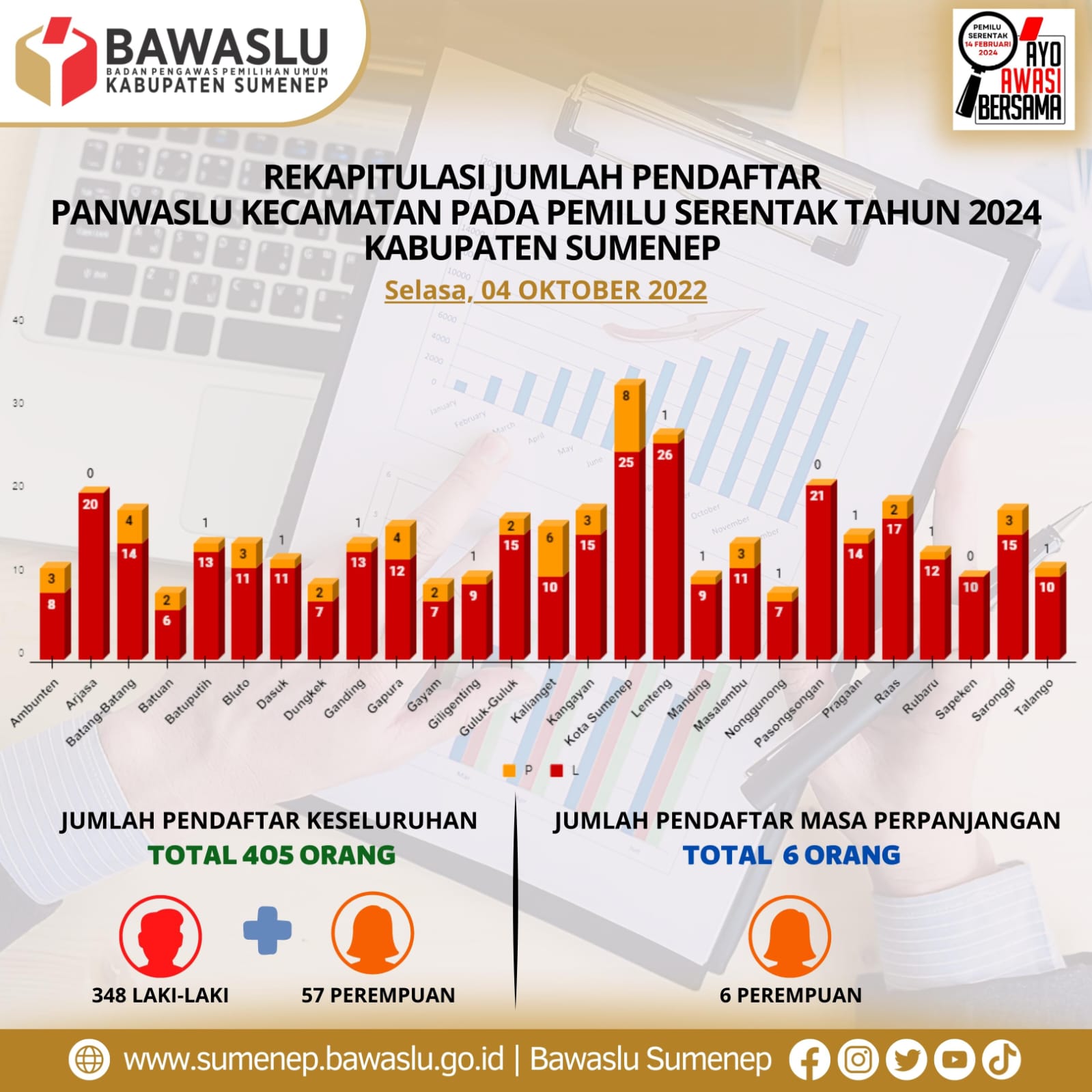 Selama 4 Hari masa perpanjangan dibuka, sejak 2 Oktober 2022 sampai berita ini dirilis (5 Okboer 2022), sebanyak 6 orang telah mendaftarkan diri secara langsung ke Kantor Sekretariat Bawaslu Kabupaten Sumenep.