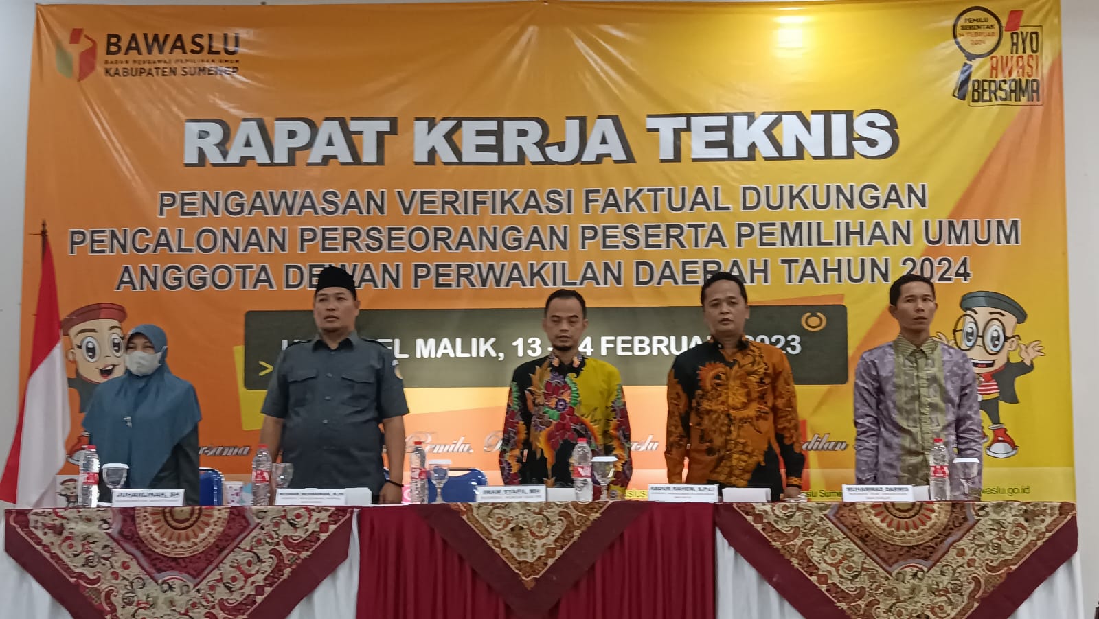 sumenep.bawaslu.go.id - SUMENEP. Bawaslu Kabupaten Sumenep menyelenggarakan Rapat Kerja Teknis Pengawasan Verifikasi Faktual Dukugan Pencalonan Perseorangan Peserta Pemilihan Umum Anggota Dewan Perwakilan Daerah Tahun 2024, Di Hotel El Malik (13-14 Februari 2023).
