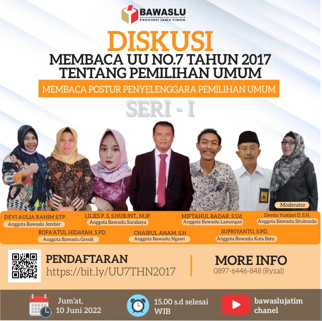 Dengan demikian maka Bawaslu Provinsi Jawa Timur menyelenggarakan Diskusi dengan tema membaca Undang-Undang 7 Tahun 2017 tentang Pemilihan Umum, Jumat (10/06/2022) secara daring. Bawaslu Provinsi Jawa Timur berkolaborasi dengan Bawaslu Kabupaten/Kota se-Jawa Timur dan kegiatan ini terbuka untuk umum.