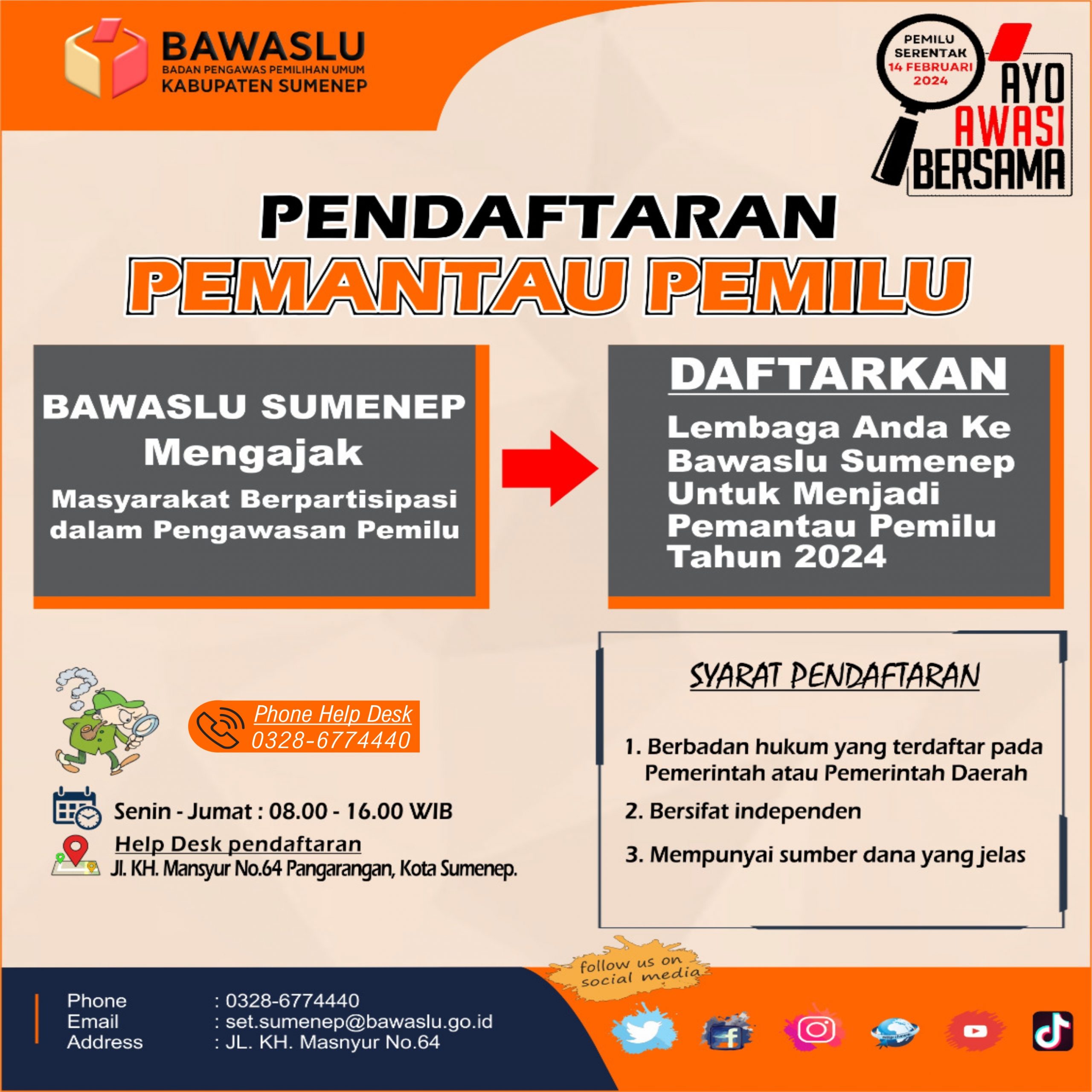sumenep.bawaslu.go.id - SUMENEP. Bawaslu secara resmi membuka pendaftaran Pemantau Pemilu 2024 yang ditandai dengan peluncuran Meja Layanan Pemantau Pemilu 2024 pada Jumat (10/6/2022) yang lalu.