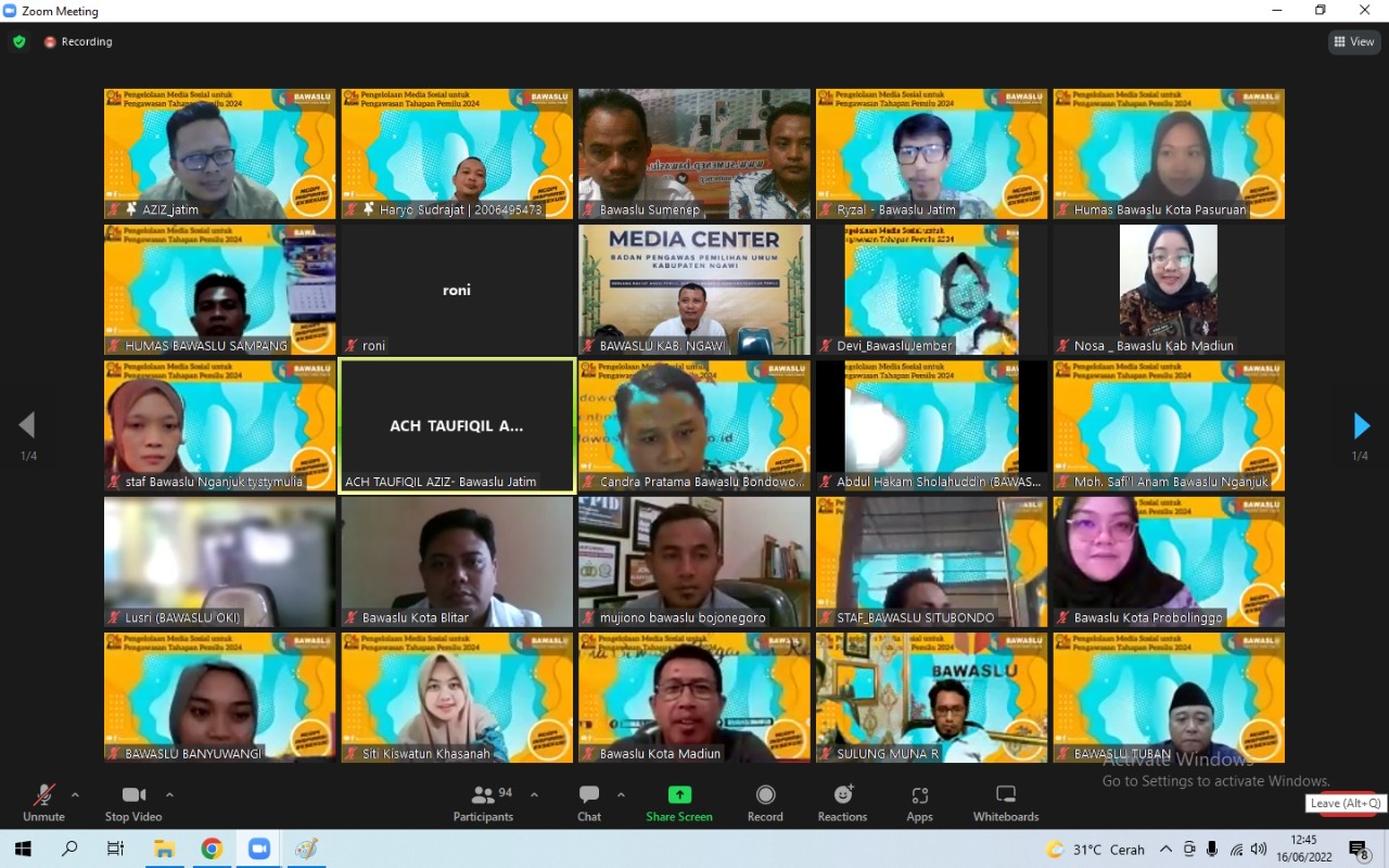 Kegiatan ini dilaksanakan secara daring, selain Bawaslu Kabupaten/Kota se-Jawa Timur juga terbuka untuk Bawaslu diseluruh Indonesia.