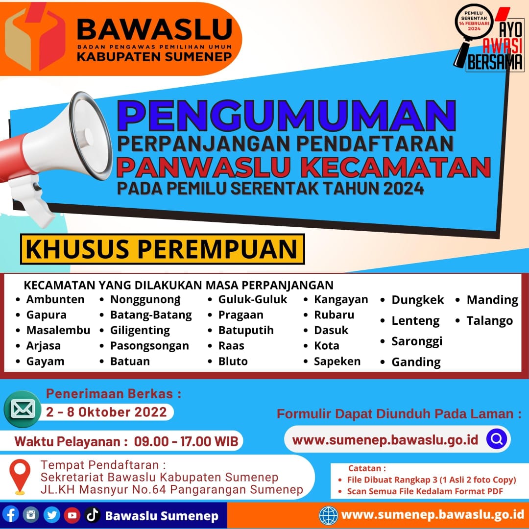 PENGUMUMAN PERPANJANGAN MASA PENDAFTARAN CALON ANGGOTA PANWASLU KECAMATAN DALAM PEMILU SERENTAK 2024