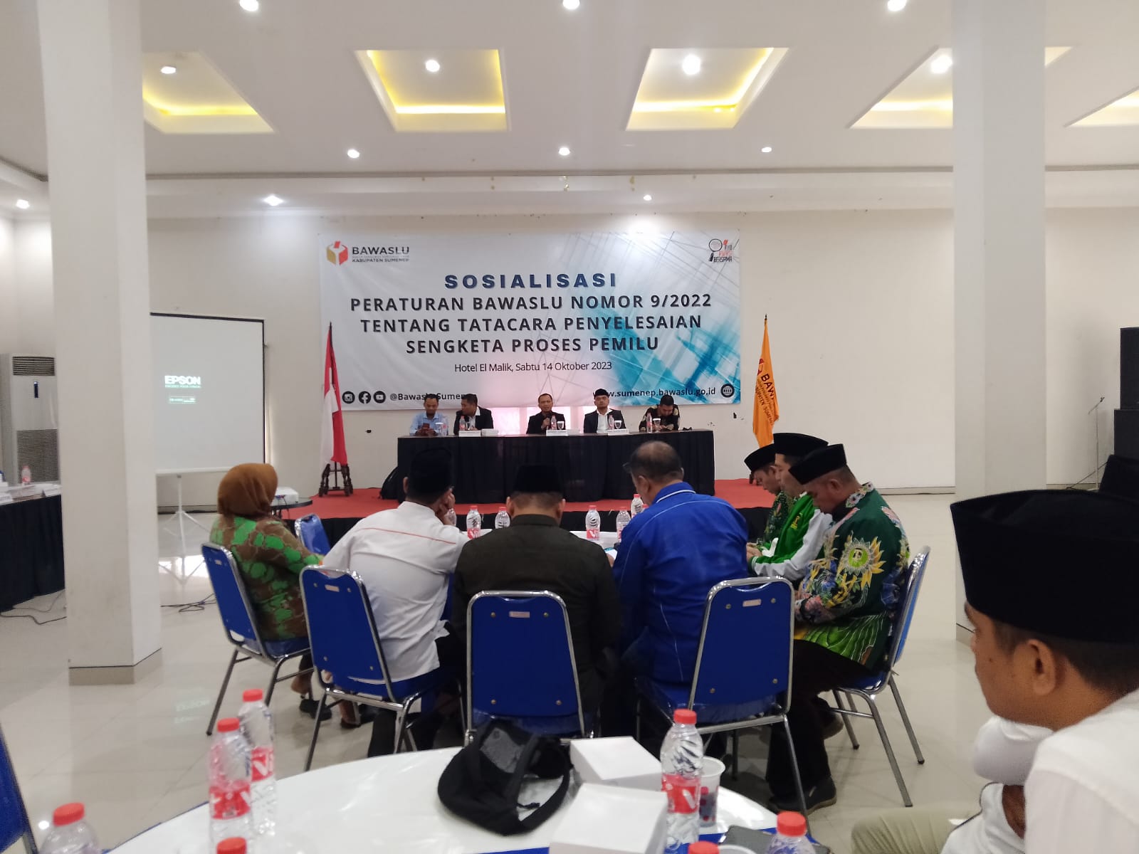 sumenep.bawaslu.go.id – SUMENEP. Dalam rangka menginformasikan wawasan tentang Peraturan Badan Pengawas Pemilihan Umum, Bawaslu Kabupaten Sumenep menggelar Kegiatan Sosialisasi Peraturan Bawaslu Nomor 9 Tahun 2022 Tentang Tatacara Penyelesaian Sengketa Proses Pemilu, di El Malik Hotel Sumenep, Sabtu (14 Oktober 2023).