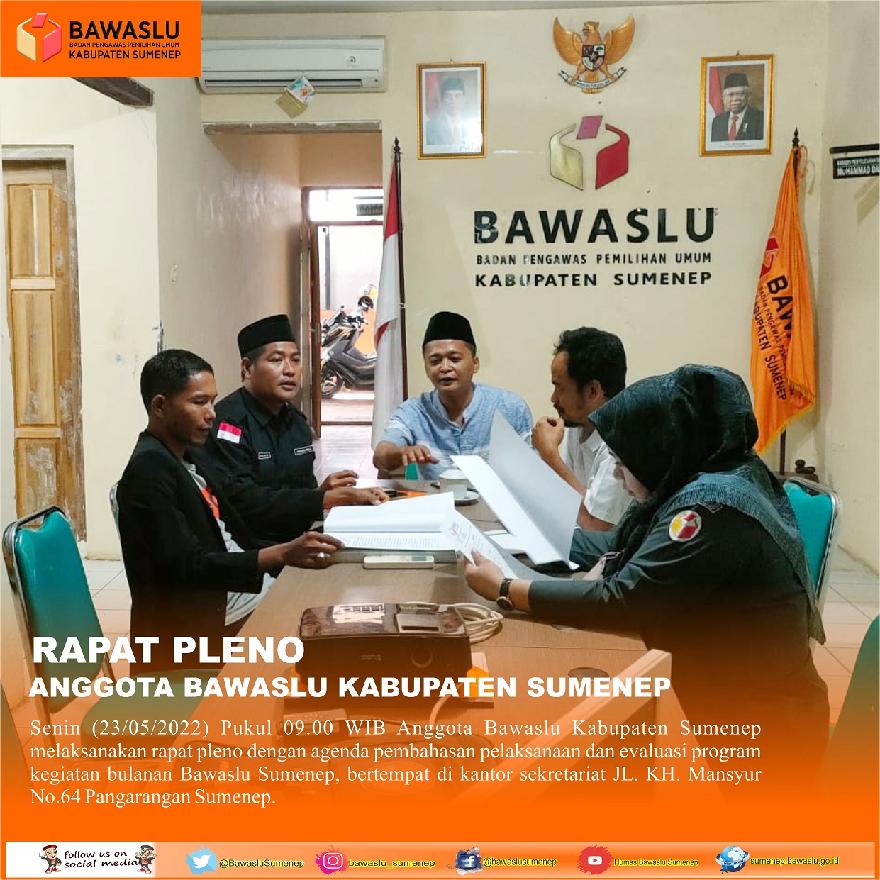 sumenep.bawaslu.go.id - SUMENEP. Anggota Bawaslu Kabupaten Sumenep melaksanakan Rapat Pleno dengan agenda pembahasan pelaksanaan dan evaluasi program kegiatan bulanan Bawaslu Sumenep, kegiatan tersebut dilaksanakan di Kantor Sekretariat JL. KH. Mansyur No. 64 Pangarangan Sumenep.