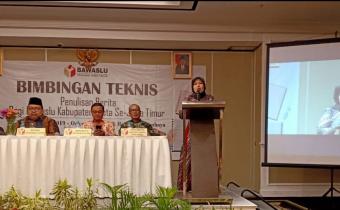 Sambutan Nur Elya Anggraini dalam pembukaaan acara Bimbingan Teknis Penulisan Berita Bagi Bawaslu Kabupaten/Kota Se-Jawa Timur, di Oakwood Hotel & Residence Surabaya, Senin (23/09/2019).