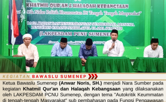 Ketua Bawaslu Sumenep (Anwar Noris, SH.) menjadi Nara Sumber pada kegiatan Khatmil Qur'an dan Halaqah Kebangsaan yang dilaksanakan oleh LAKPESDAM PCNU Sumenep, dengan tema "Autokritik Keummatan di tengah-tengah Masyarakat" sub pembahasan pada Fungsi Pengawasan dalam Menjaga Kondusifitas Ummat di Tengah Kontestasi Politik, hari Minggu (02 April 2023) di Kantor PC NU Sumenep.