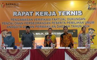 sumenep.bawaslu.go.id - SUMENEP. Bawaslu Kabupaten Sumenep menyelenggarakan Rapat Kerja Teknis Pengawasan Verifikasi Faktual Dukugan Pencalonan Perseorangan Peserta Pemilihan Umum Anggota Dewan Perwakilan Daerah Tahun 2024, Di Hotel El Malik (13-14 Februari 2023).