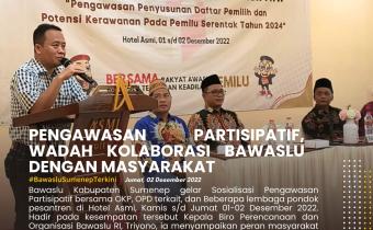 sumenep.bawaslu.go.id - SUMENEP. Bawaslu Kabupaten Sumenep gelar Sosialisasi Pengawasan Partisipatif Pengawasan Penyusunan Daftar Pemilih dan Potensi Kerawanan pada Pemilu serentak Tahun 2024, di Hotel Asmi, 1-2 Desember 2022.