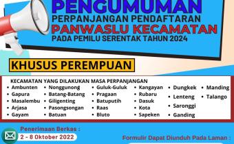 sumenep.bawaslu.go.id - SUMENEP. Kelompok Kerja Rekrutmen Panwaslu Kecamatan Bawaslu Kabupaten Sumenep, melakukan perpanjangan waktu pendaftaran , 2-8 Oktober 2022.