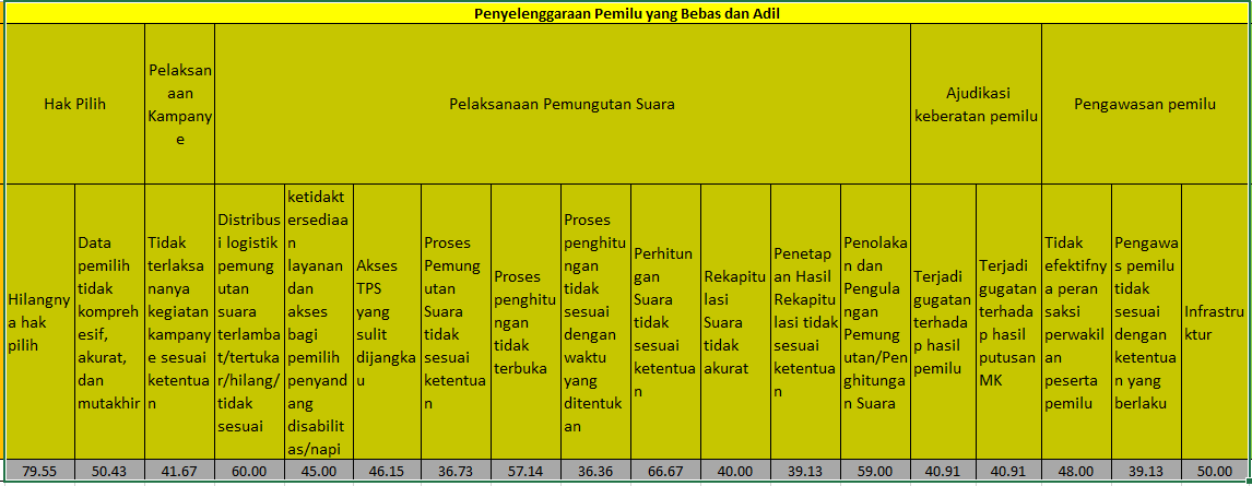 Dalam penyelenggaraan pada tahapan Pemilihan Kepala Daerah di Kabupaten Sumenep, berdasar hasil survey dinyatakan cukup. Dimana dalam penyelenggaran Pemilu terdapat subdimensi, hak pilih, pelaksanaan kampanye, pelaksanaan pemungutan suara, ajudikasi keberatan Pemilu, pengawasan Pemilu. Dalam pelaksanaan Kampanye, pelaksanaan pemungutan suara, ajudikasi keberataran Pemilu tidak ada permasalahan yang berarti. Hanya ada beberapa hal yang perlu kita tingkatkan sebagai upaya pencegahan. Diantaranya adanya pengawasan dan koordinasi kelembagaan dengan pihak terkait untuk terus ditingkatkan.