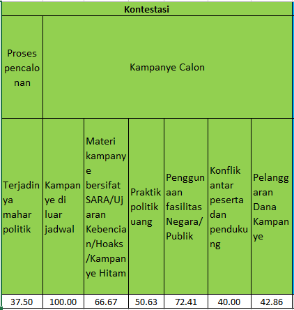 Pada sub-dimensi kontestasi, terdapat tiga subsub-komponen yang melebihi dari 60%. Seperti kampanye diluar jadwal. Untuk sub-sub dimensi kampanye diluar jadwal sangat berpotensi sekali akan terjadi. Sekitar 100% yang menyatakan bahwa kampanye diluar jadwal akan dilakukan oleh para kontestasn dalam pelaksanaan pilkada 2020.