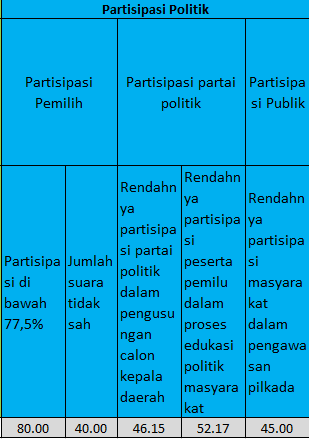 Sementara untuk sub-dimensi partai politik dan partisipasi public dinyatakan cukup. Sehingga kita cukup mendorong dan mengajak masyarakat dan partai politik untuk terus mengambil bagian pentiing dalam pelaksanaan pilkada.