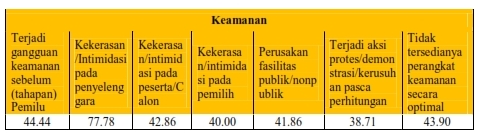 Sub dimensi keamanan dalam survie yang dilakukan oleh Bawaslu Sumenep terbagi pada 7 sub-sub dimensi. Ketujuh sub dimensi ini dilakukan dalam rangka mengukur tingkat keamanan pelaksanaan Pilkada dari berbagai hal, mulai dari pelaksanaan pra tahapan, tahapan dan pasca tahapan. Termasuk terjadi beberapa intimidasi, baik pada penyelenggara, peserta/calon, pemilih, fasilitas publik/ non publik, Terjadi aksi protes/demonstrasi/kerusuhan pasca perhitungan dan Tidak tersedianya perangkat keamanan secara optimal. Dari ketujuh indicator keamanan potensi rawan dapat dinyatakan cukup, namun kekerasan terhadap penyelenggara perlu dilakukan untuk ditingkatkan koordinasi dengan pihak pihak terkait. Hal ini dilakukan dalam rangka agar tidak terjadi kekerasan terhadap penyelenggara.