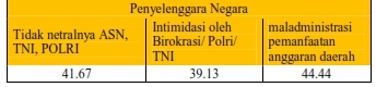 Penyelenggara negara merupakan salah satu dimensi negara yang memiliki fungsi layanan. Sehingga keberadaannya harus bebas dari berbagai benturan kepentingan. Salah satunya adalah terkait dengan netralitas ASN, TNI dan POLRI. Berdasarkan hasil survi tingkat ketidak netralan ASN, TNI dan POLRI sebesar 41.67%. ini merupakan kategori cukup dalam tingkat potensirawan. Sehingga perlu ada upaya-upaya pencegahan.