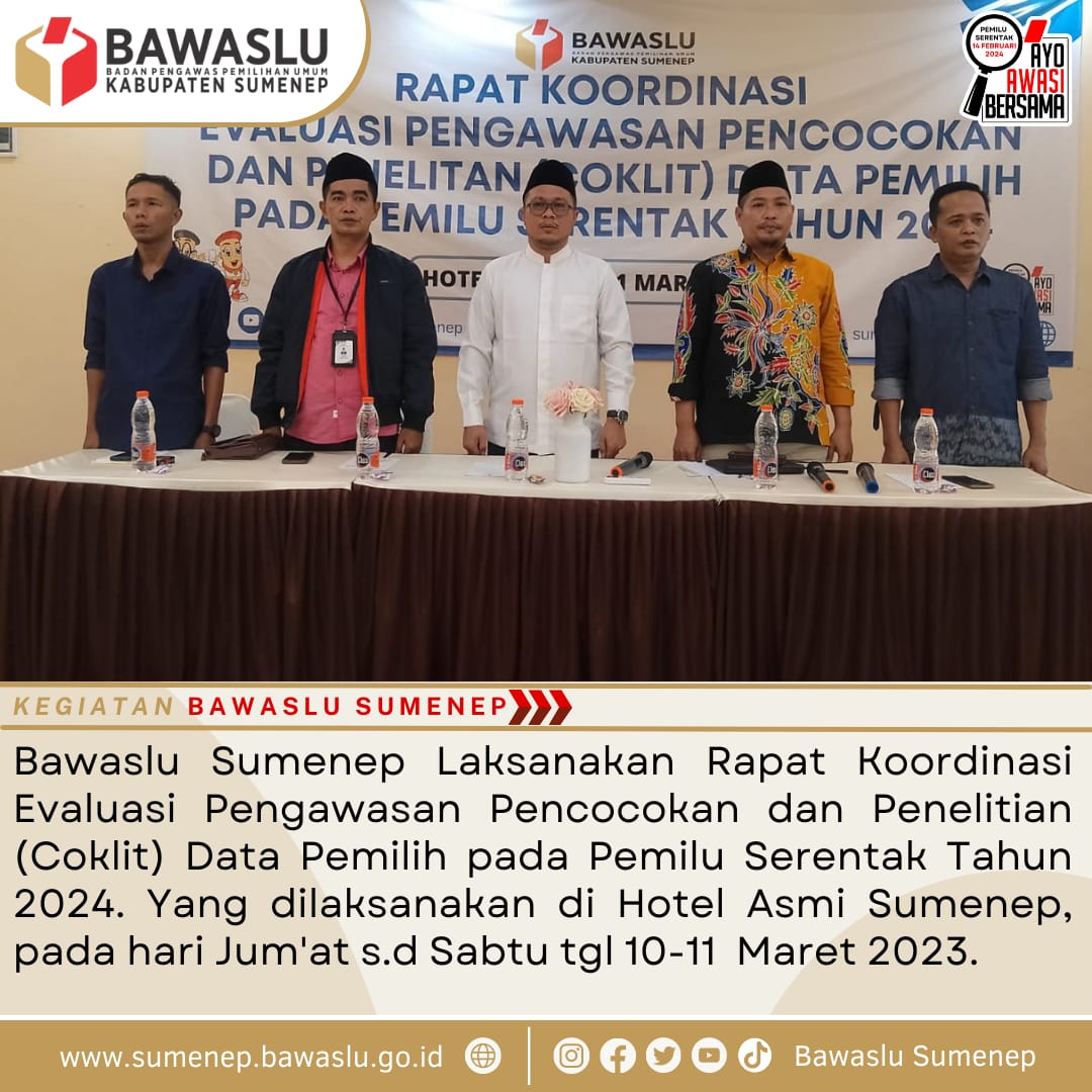 sumenep.bawaslu.go.id - SUMENEP. Hasil Pengawasan uji fakta yang dilakukan oleh Panwaslu kecamatan beserta Panwaslu Kelurahan/Desa, tercatat puluhan dugaan pelanggaran telah ditindak lanjuti dengan mengirimkan Surat Saran Perbaikan. Oleh karena itu Bawaslu Kabupaten Sumenep selenggarakan Rapat Koordinasi Evaluasi Pengawasan Pencocokan dan penelitian (COKLIT) Data Pemilih pada Pemilihan Umum Tahun 2024, di Hotel Asmi Sumenep pada hari Jum’at s.d Sabtu tanggal 10-11 Maret 2023.