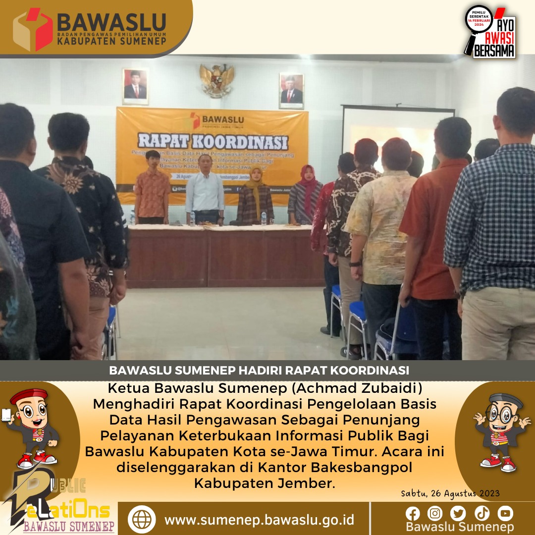 sumenep.bawaslu.go.id-JEMBER Rapat Koordinasi Pengelolaan Basis Data Hasil Pengawasan sebagai upaya untuk mendukung pelayanan keterbukaan informasi publik oleh Badan Pengawas Pemilihan Umum (Bawaslu) di Kabupaten dan Kota se-Jawa Timur, bertempat di Kantor Bakesbangpol Kabupaten Jember, Sabtu, 26/08/2023.