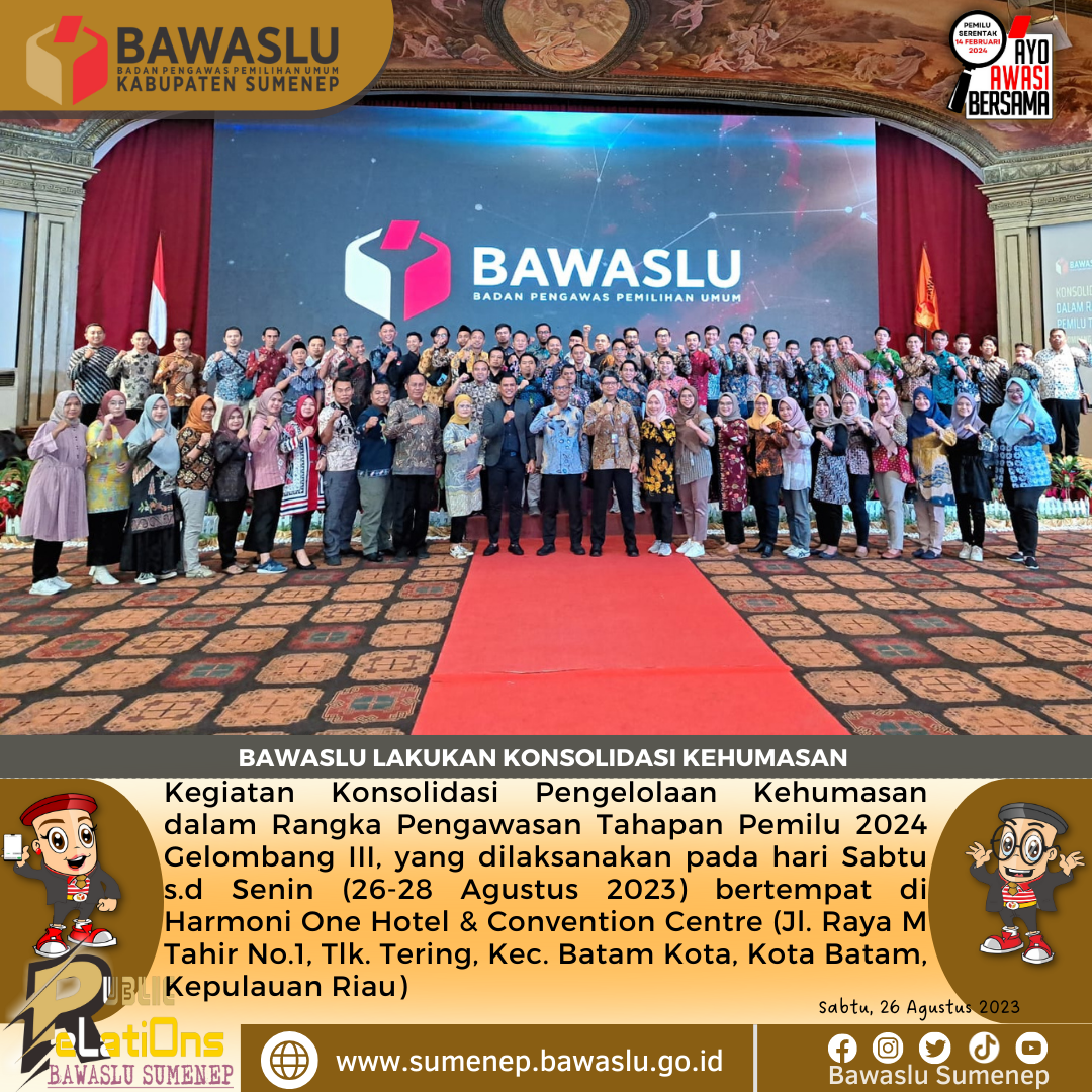 sumenep.bawaslu.go.id-BATAM Kegiatan Konsolidasi Pengelolaan Kehumasan dalam Rangka Pengawasan Tahapan Pemilu 2024 Gelombang III, yang dilaksanakan pada hari Sabtu s.d Senin (26-28 Agustus 2023) bertempat di Harmoni One Hotel & Convention Centre (Jl. Raya M Tahir No.1, Tlk. Tering, Kec. Batam Kota, Kota Batam, Kepulauan Riau)