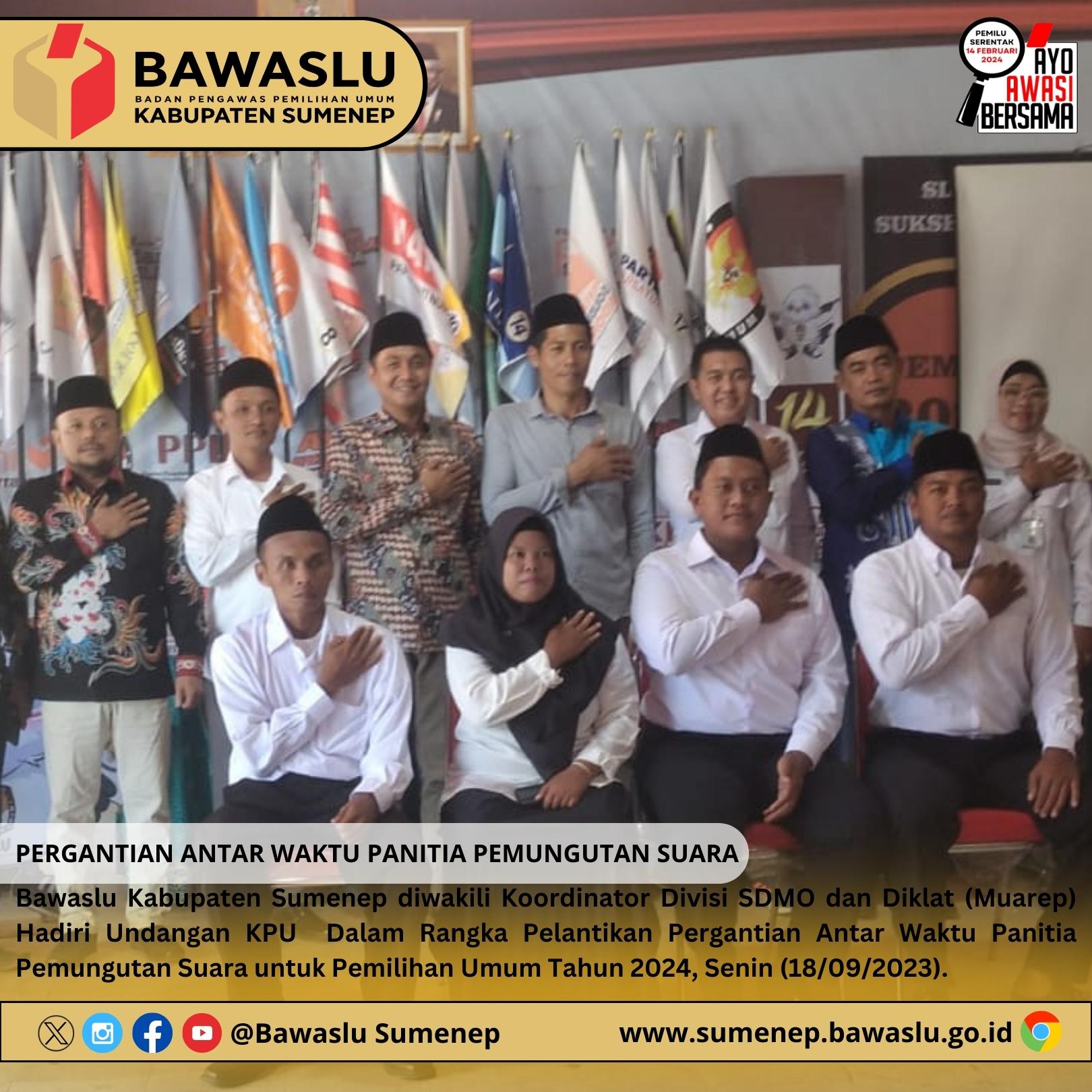 Bawaslu Kabupaten Sumenep diwakili Koordinator Divisi SDMO dan Diklat (Muarep) Hadiri Undangan KPU Dalam Rangka Pelantikan Pergantian Antar Waktu Panitia Pemungutan Suara untuk Pemilihan Umum Tahun 2024, Aula Kantor KPU, Senin (18/09/2023).