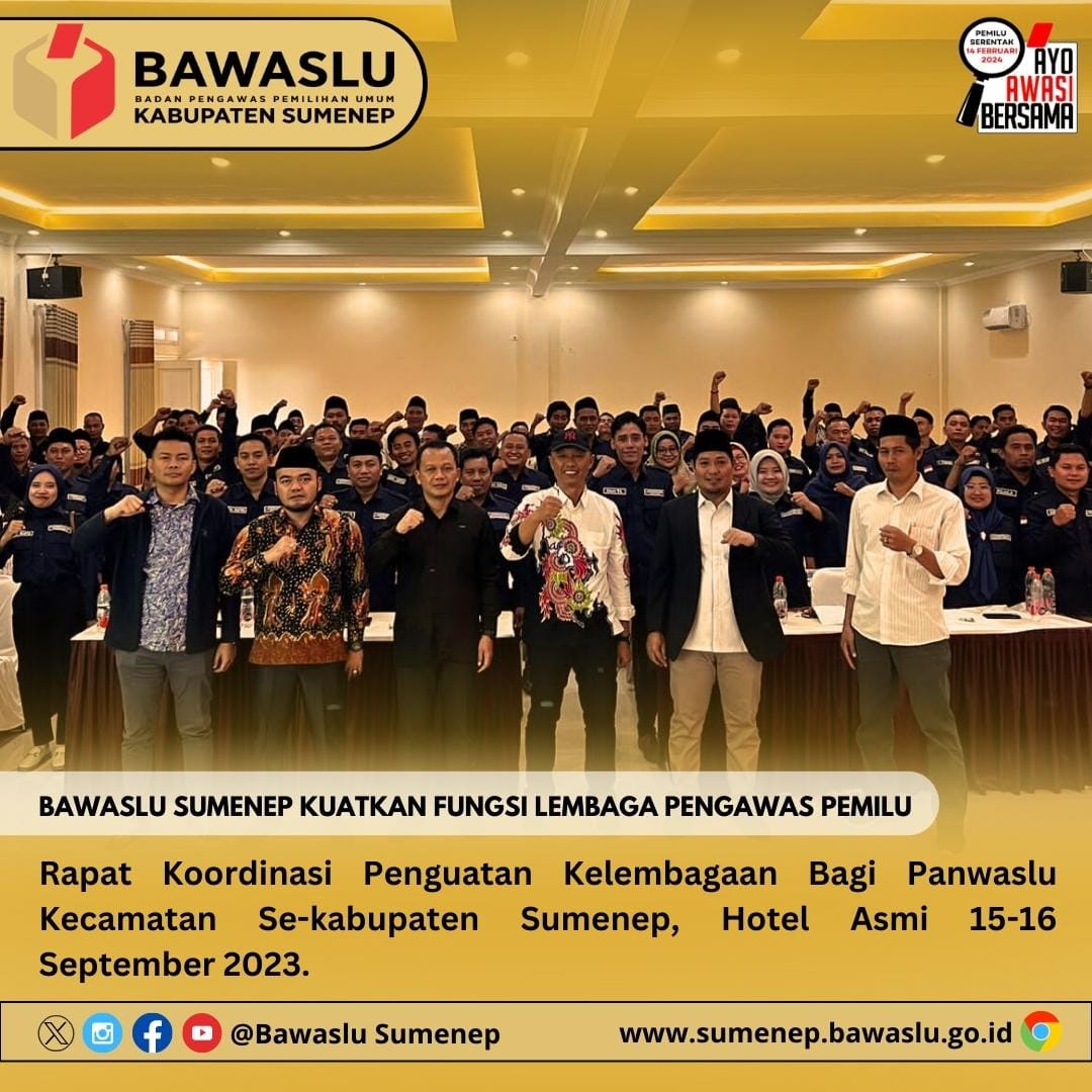 Bawaslu kabupaten Sumenep gelar rapat koordinasi Penguatan Kelembagaan bagi panwaslu kecamatan se-kabupaten Sumenep di Hotel Asmi, Jumat sampai dengan Sabtu (15-16 September 2023).