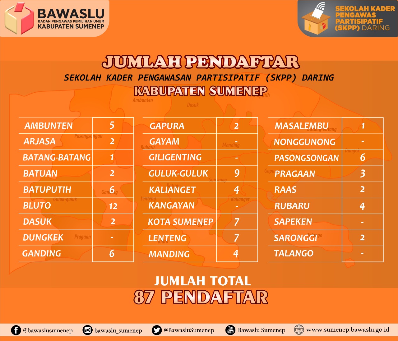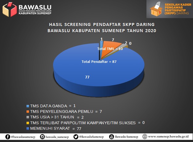 Hasil Screening Bawaslu Sumenep, 87 Orang yang terdaftar secara online tersebut ternyata tersebar di 20 Kecamatan. Diantaranya 12 Orang dari Kecamatan Bluto, 9 Orang berasal dari Guluk-Guluk, 7 Orang dari Kecamatan Kota Sumenep dan Lenteng, kemudian Kecamatan Batuputih, Ganding, Pasongsongan masing-masing 6 Orang, Ambunten 5 Orang, Kalianget Manding dan Rubaru masing-masing 4 Orang, Pragaan 3 Orang, 2 Orang untuk Kecamatan Arjasa, Batuan, Dasuk, Gapura, Raas, dan Saronggi, terahir 1 Orang untuk Batang-Batang dan Masalembu.