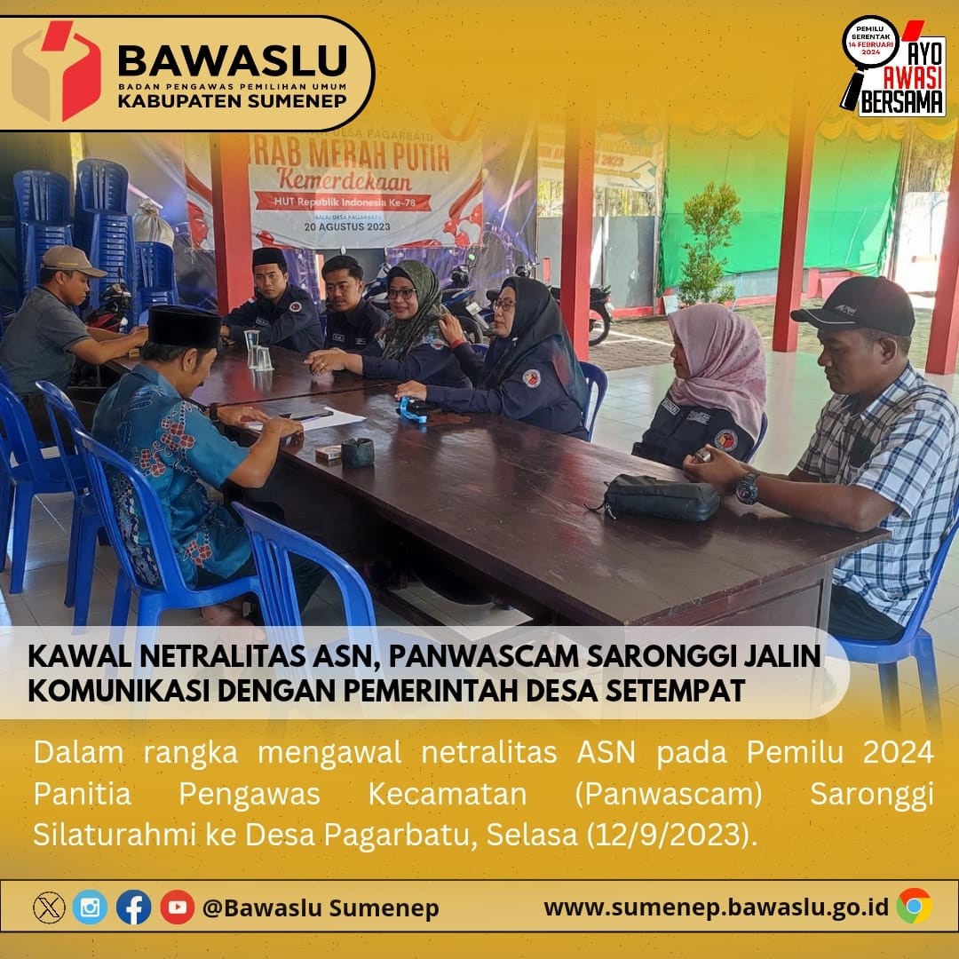 Dalam rangka mengawal netralitas ASN pada Pemilu 2024 Panitia Pengawas Kecamatan (Panwascam) Saronggi Silaturahmi ke Desa Pagarbatu, Sumenep, Madura, Jawa Timur melakukan silaturrahmi, Selasa (12/9/2023).