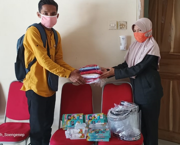 Koordinator Sekretariat Bawaslu Sumenep, Juharlinah (Kanan) membagikan APD kepada salah satu Panitia Pengawas Kecamatan (Panwascam) di Kantor Bawaslu Sumenep.