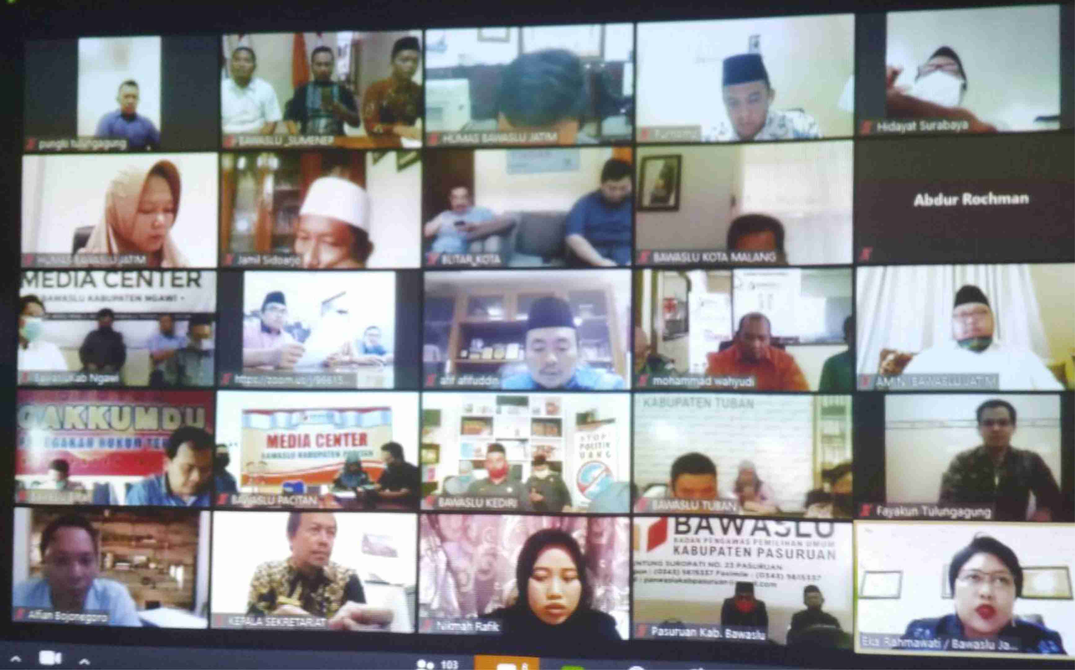 sumenep.bawaslu.go.id - Sumenep. Bawaslu Jawa Timur gelar Rapat Koordinasi Persiapan Riset Evaluasi Pilkada Serentak Tahun 2015-2018 bersama 38 Bawaslu Kabupaten/Kota, acara tersebut dilaksanakan secara daring/Online Meeting, Senin (11/5/2020). Peserta yang hadir dalam jaringan tersebut adalah Ketua Serta Anggota Bawaslu Kabupaten/Kota se-Jawa Timur.