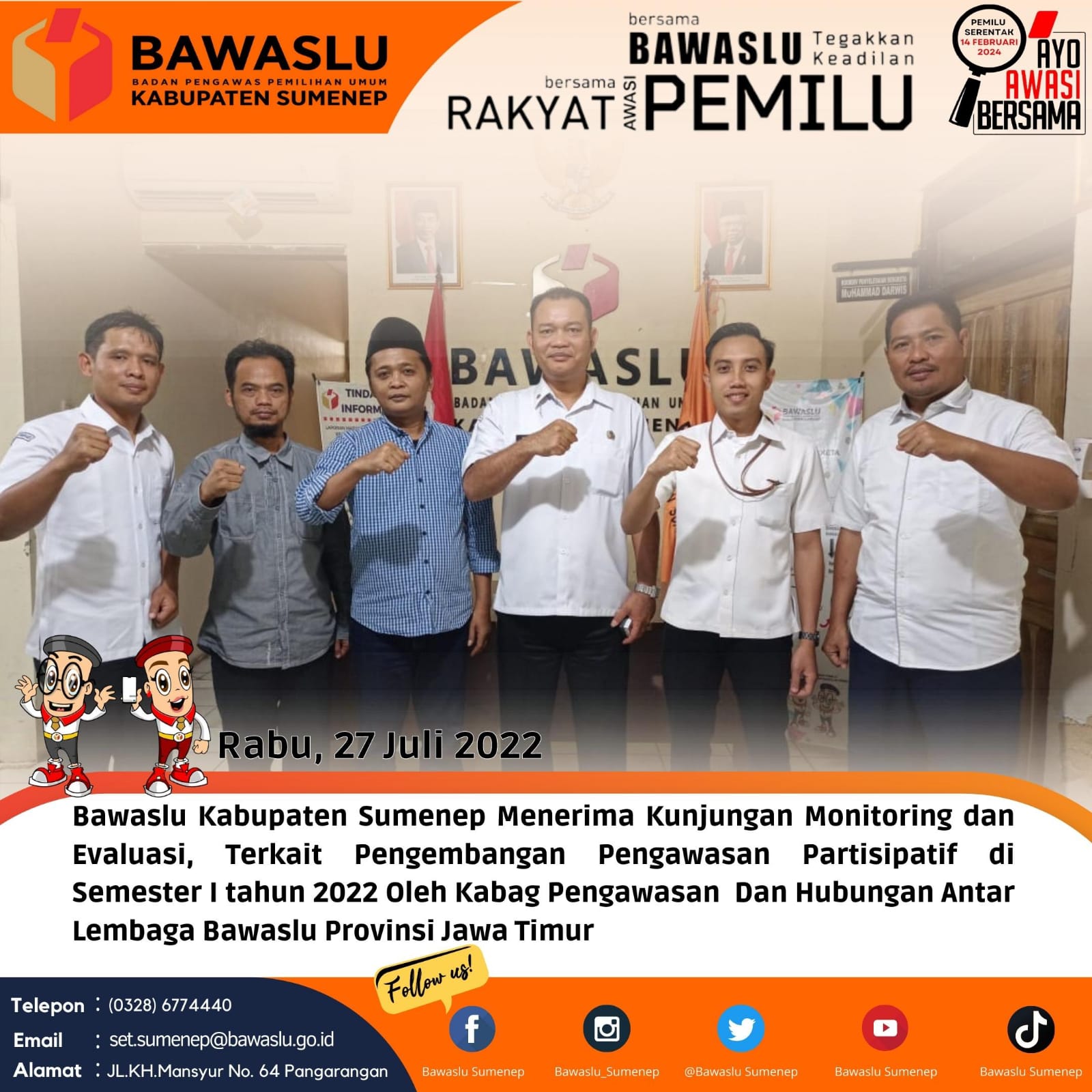 sumenep.bawaslu.go.id - SUMENEP. Bawaslu Sumenep menerima kunjungan dari Bawaslu Provinsi Jawa Timur terkait dengan kegiatan Monitoring dan evaluasi pengembangan pengawasan partisipatif di semester I, Rabu (27/7/2022).