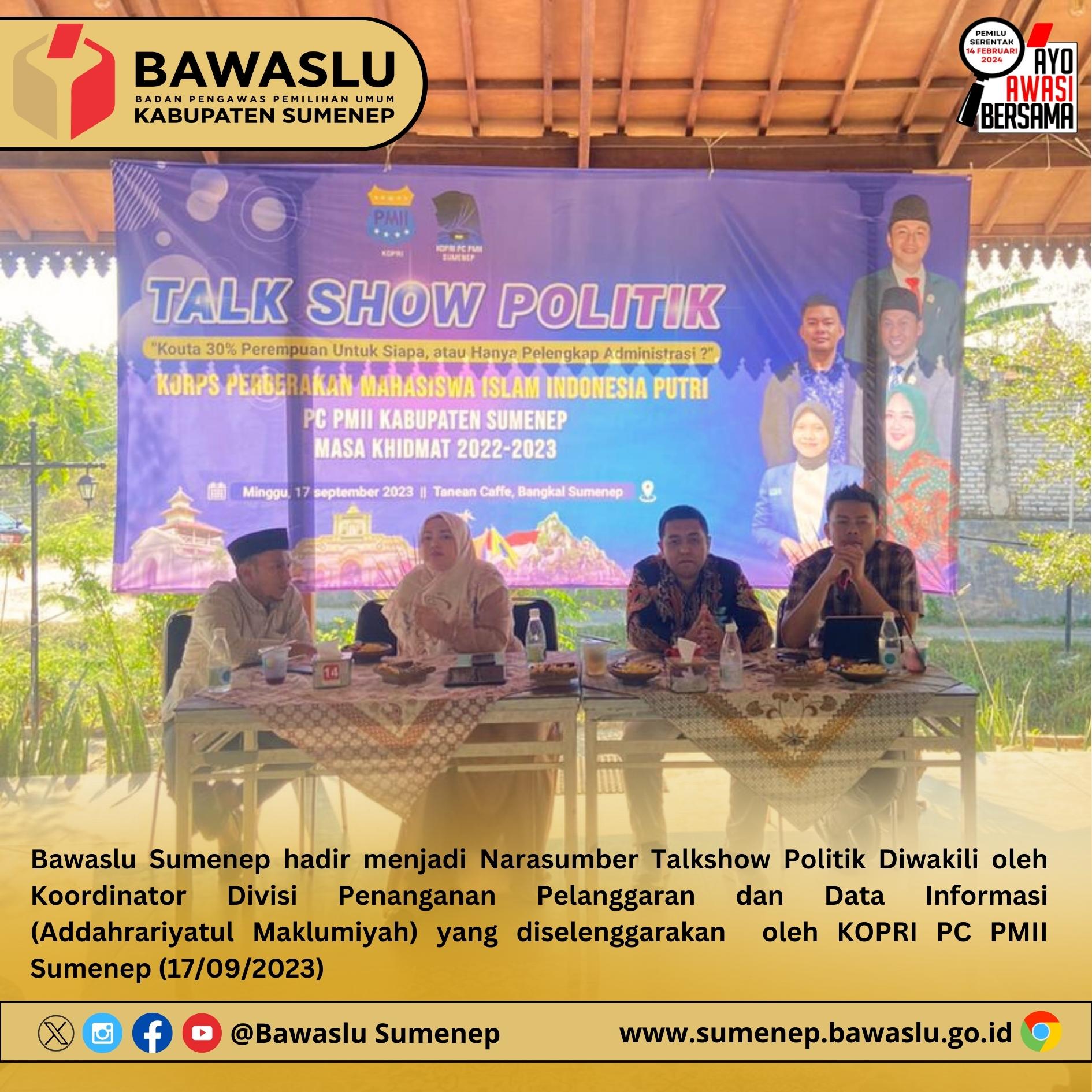 Dalam kesempatan ini hadir sebagai narasumber KPU Kabupaten Sumenep (Deki Prasetia Utama), Bawaslu Sumenep (Addahrariyatul Maklumiyah), Anggota DPRD Kabupaten Sumenep (Irwan Hayat), juga Anggota DPRD Jawa Timur (Hj. Nurfitriana, SE. MM.).
