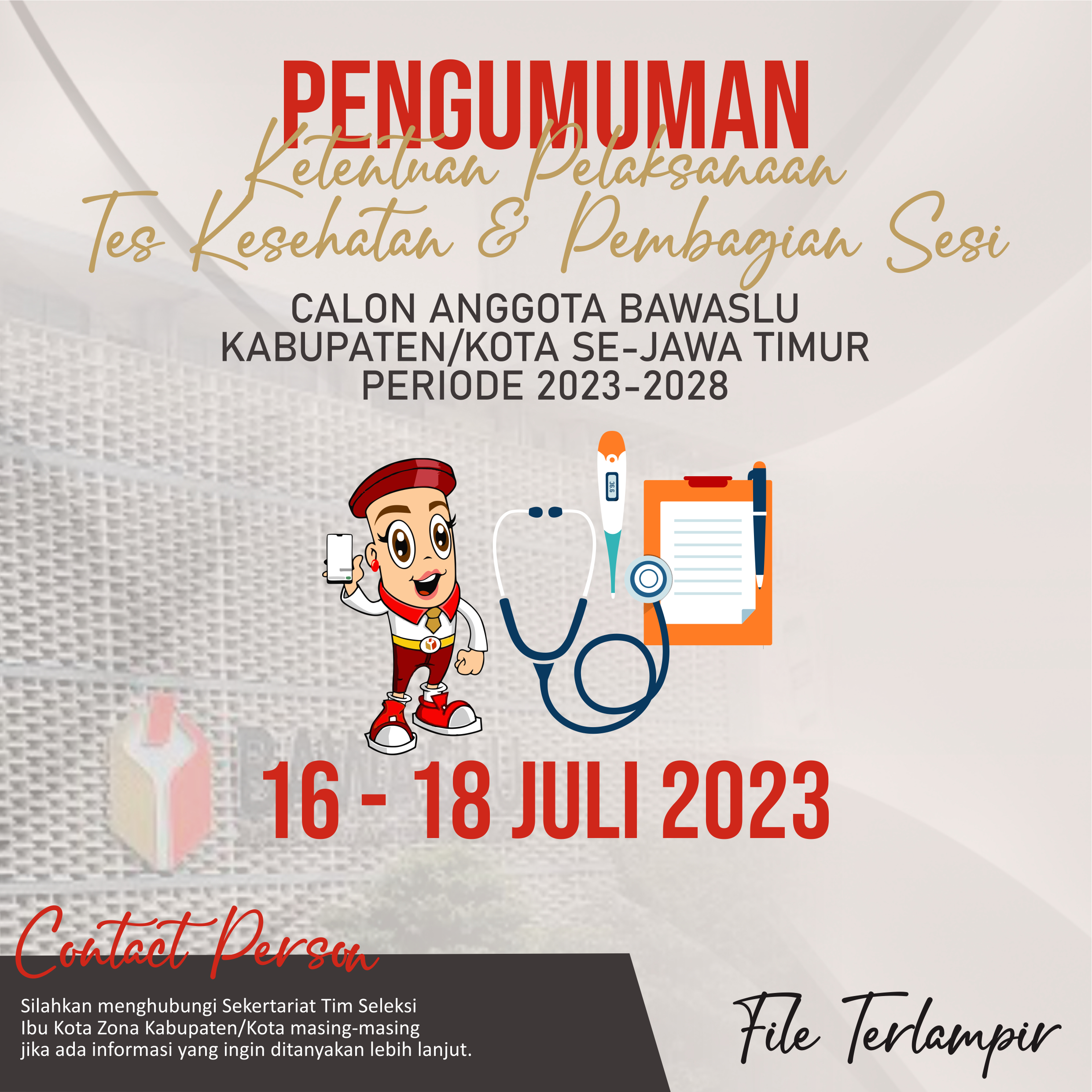 PENGUMUMAN KETENTUAN PELAKSANAAN TES KESEHATAN DAN PEMBAGIAN SESI CALON ANGGOTA BAWASLU KABUPATEN/KOTA MASA JABATAN 2023-2028