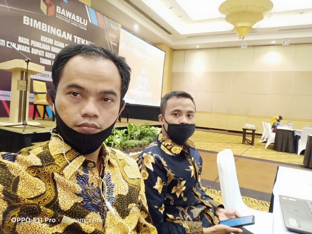 Sementara dalam pelaksanaan kegiatan Bimbingan Teknis hukum acara penanganan perkara perselisihan hasil pemilihan bupati dan wakil bupati dan/atau wali kota dan wakil kota yang Selenggarakan daring oleh MK difasilitasi dalam ruangan bersama antar Bawaslu kabupaten / kota se-Jawa Timur di Hotel Santika Malang.