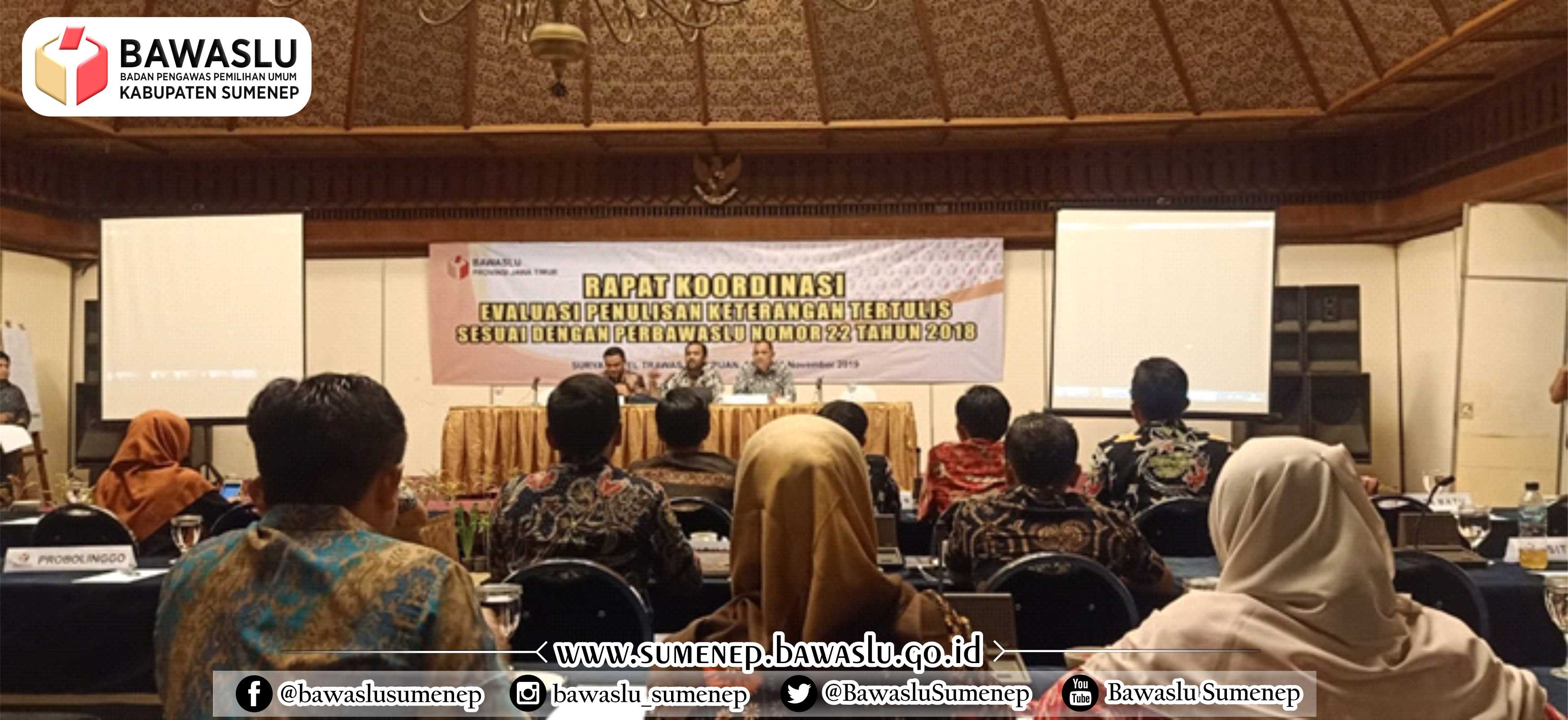sumenep.bawaslu.go.id – Pasuruan. Bawaslu Provinsi Jawa Timur menyelenggarakan "Rapat Koordinasi Evaluasi Penyusunan Keterangan Tertulis Sesuai dengan Perbawaslu Nomor 22 Tahun 2018 Tentang Tata Cara Pemberian Keterangan Dalam Perselisihan Hasil Di Mahkamah Konstitusi” tanggal 6 - 8 November 2019. Peserta kegiatan dihadiri oleh Koordinator Divisi Hukum Data dan Informasi (HDI), Koordinator Divisi Penindakan Pelanggaran (PP), Koordinator Divisi Penyelesaian Sengketa (PS) serta 1 (satu) Staf HDI pada 38 Bawaslu Kab/kota se- Jawa Timur di Surya Hotel dan Cottage, Prigen Pasuruan.