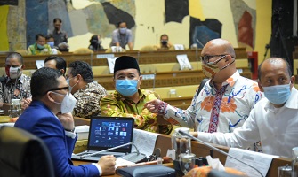 Ketua Komisi II DPR RI Ahmad Doli Kurnia (baju warna biru) berbincang dengan pimpinan penyelenggara pemilu dalam Rapat Dengar Pendapat di Gedung Parlemen Senayan, Jakarta, Senin 21 September 2020/Foto: Humas Bawaslu RI