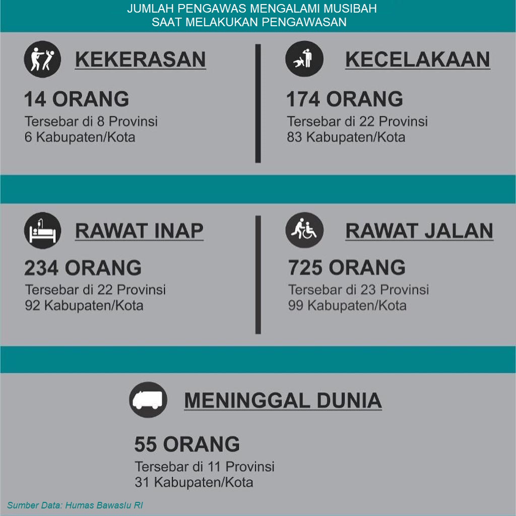 Pemilu kali ini juga menyisakan kepiluan bagi banyak keluarga jajaran penyelenggara. Durasi kerja yang panjang, tekanan lingkungan pekerjaan yang memaksa untuk segera menyelesaikan perhitungan suara di TPS karena tahapan berikutnya juga sudah menunggu membuat banyak jajaran penyelenggara staminanya down. Tidak mudah bekerja terus menerus 3 kali 24 jam nyaris tidak meninggalkan TPS. Dari mulai persiapan H-1, hari H dan H+1. Saya menerima laporan jumlah jajaran pengawas yang meninggal sampai tadi malam 25 April 2019 jam 11.05 bertambah menjadi 55 orang, yang akhirnya harus dirawat inap sebanyak 234 orang, yang rawat jalan sebanyak 725 orang, yang kecelakaan 174 orang sedang yang mengalami tindak kekerasan kurang lebih 14 orang. Kondisi yang sangat luar biasa jika dibanding dengan pemilu sebelumnya.