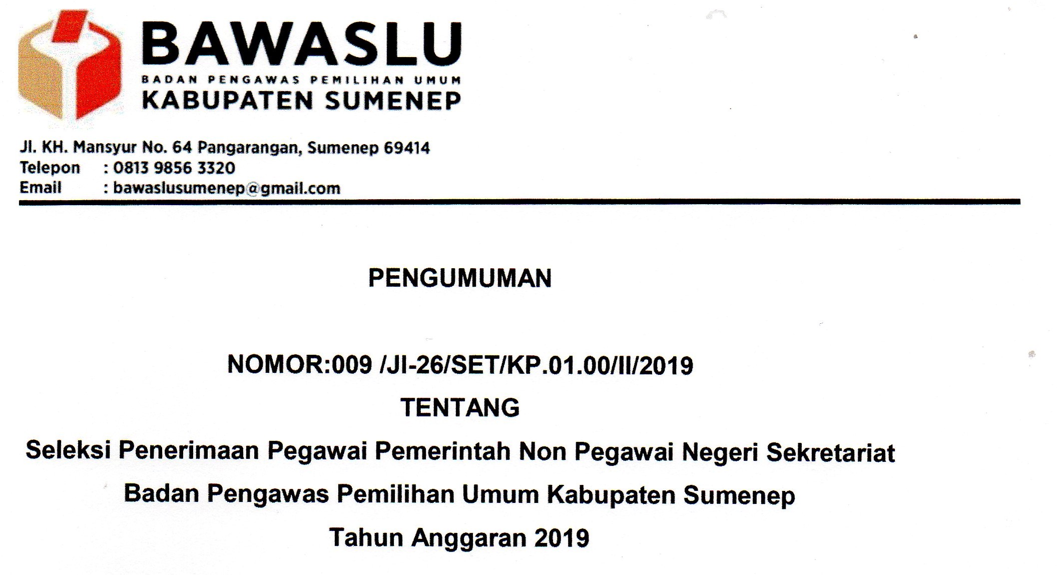 Seleksi Penerimaan Pegawai Pemerintah Non Pegawai Negeri Sekretariat Badan Pengawas Pemilihan Umum Kabupaten Sumenep Tahun 2019