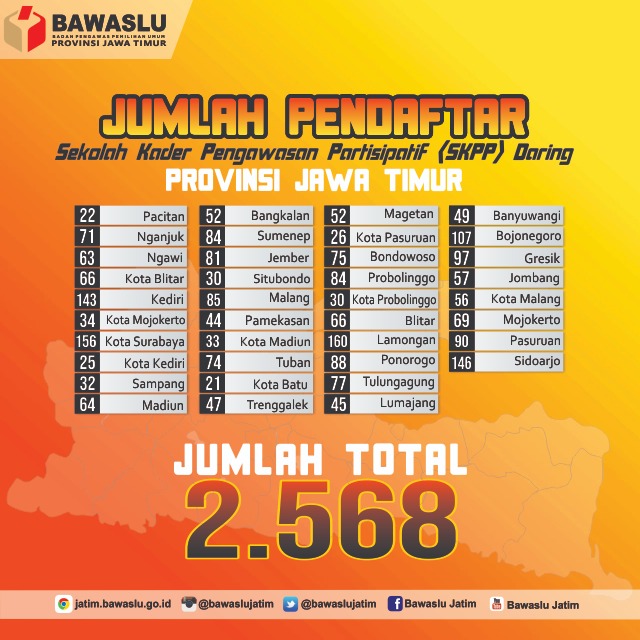 Sementara calon Kader Pengawasan Partisipatif dari Provinsi Jawa Timur Tercatat 2.568 orang yang telah mendaftarkan diri untuk menjadi bagian pengawas partisipatif.