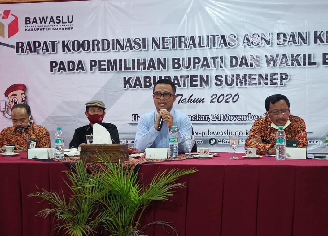 sumenep.bawaslu.go.id - Sumenep. Rapat Koordinasi netralitas ASN dan kepala desa pada Pemilihan Bupati Dan Wakil Bupati Kabupaten Sumenep Tahun 2020 yang diselenggarakan Bawaslu Sumenep di Hotel utami sebagai upaya meningkatkan pemahaman terkait netralitas Aparatur Sipil Negara (ASN) dan kepala desa, (24/11/2020).