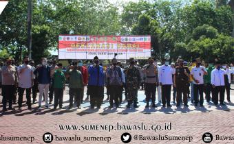 Foto bersama setelah Apel Deklarasi Damai, Wakil Bupati Sumenep, Kapolres Sumenep, Dandim 0827 Sumenep, Ketua Pengadilan Negeri Sumenep, Kepala Kejaksaan Negeri Sumenep, KPU Kabupaten Sumenep, Ketua Bawaslu Ka