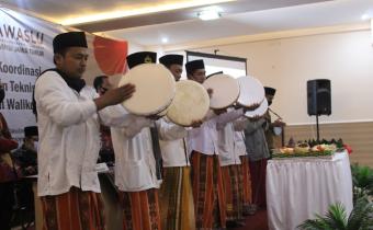 pemotongan Tumpeng oleh Kepala Sekretariat Bawaslu Jawa Timur, Sapni Syahril, S.IP., M.Si., didampingi Koordiv. SDMO Bawaslu Sumenep, Hosnan Hermawan (kanan) dan Koordiv.